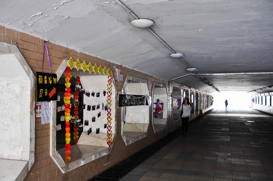 如今,隧道早已不“寂寞”。南校师生都很喜欢从人行通道走过,即使是匆匆走过的学子也会忍不住留步欣赏:通道两侧墙壁上的各单位宣传橱窗里,有教学、科研等相关信息,成为学生了解校情院情的信息平台;而人行通道中间的一堵镂空墙更是学生活动宣传的风水宝地,有社团活动宣传的手工作品,有精美的活动道具抑或是极具视觉冲击感的巨幅海报,让人很是享受。