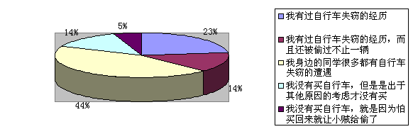 为了调查学生自行车失窃的情况,记者在校园随机抽取了100多名同学进行调查。结果显示,有车及曾经有车的同学中,37%的同学有过自行车失窃的经历,其中的14%的同学遗失过一辆以上自行车。在没有自行车的同学中,5%的同学称他们不购买自行车的原因是害怕自行车被盗。自行车失窃现象如此严重,我们究竟要怎样保护“爱骑”呢?
