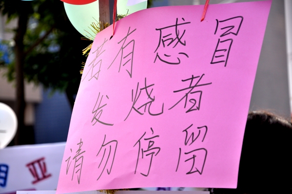 天天消毒,健康向上——曹庆国告诉记者,为更好地确保全校师生的健康,学校专门成立了预防甲流工作小组。教学区课室每天晚上的消毒工作由珠江物业负责,生活区宿舍等公共场地每周两次的消毒工作则由大众物业负责。记者得知,自从九月份以来消毒工作一直在开展,而近期则加大了力度。另外,学生大型活动如有需要举办,应按规定提前申报消毒工作。具体申报流程为:举办方提前上交活动的相关信息至后勤处——包括活动时间、地点和人数等——由后勤处的相关老师审批后安排物业公司落实消毒工作。“对于特大型的活动,如全国公务员考试和日语考试等,活动前后均进行了消毒。”他表示,“物业公司的工作人员近日都加班了,只为落实好预防甲流工作。”