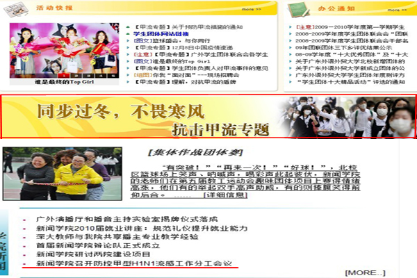 网络是个好平台——点击进我校各学院的网站,其中也不乏对于预防甲流的宣传。新闻学院与翻译学院重视网络的传播效应,在其首页或显眼的地方放置对抗甲流的小tips。新闻学院辅导员商杰强表示,通过这种方式可以提高学生的防范意识。此外,学院建立一套晨检和午检的检查制度,一旦发现有学生发烧超过38度将马上告知校门诊部。而财经学院辅导员沈长霞向记者展示学院预防甲流的创新做法,她打开了一个Q群,“这是我们财经各个班级的班委成员的QQ群,我们一有关于甲流的消息就在此公布和传达。”