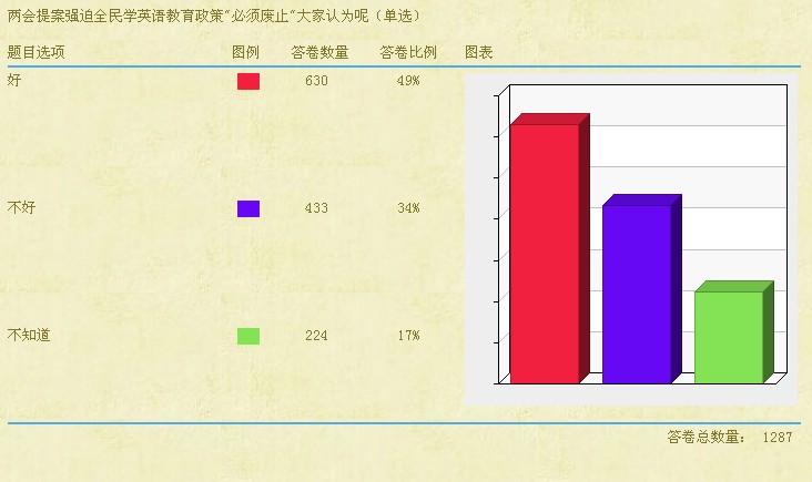 而在网上一项关于“两会提案强迫全民学英语教育政策‘必须废止’”的调查中,有1287人参与了调查,结果49%的受访者认为提案“好”,认为“不好”的占到34%,17%的受访者表示“不知道”。