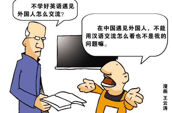 英国留学生彭同学很认真地告诉记者:“中文很重要,但英语的确是要学的,而且要从娃娃抓起。不懂得英语,就无法了解外面多姿多彩的世界,无法师夷长技以制夷;学好英语,有助于中华崛起。所以他认为全民英语很有必要。”