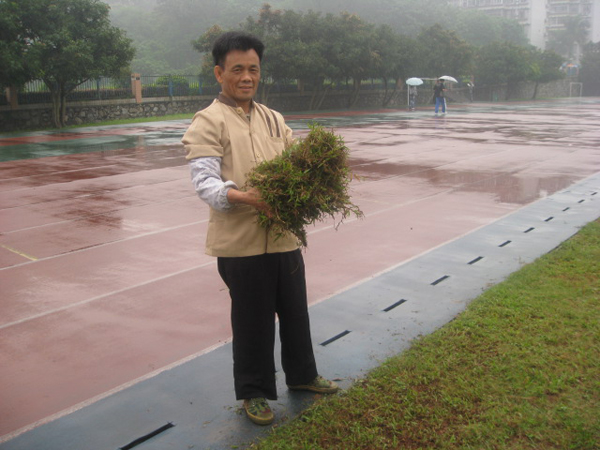 四月的广州,阴雨绵绵。在空旷的操场上,一位埋头除草的中年大叔格外显眼,他就是操场的环卫工人曾叔。曾叔是梅州人,以前在建筑工地工作,后因子女定居广州,才在去年六月携妻来此。曾叔的工作是、打扫操场垃圾和为足球场除草。每天早上七点,他准时出发,走过诺大的操场,仔细清扫主席台、足球场、跑道,直到下午五点将垃圾袋装进车子,曾叔才算结束了一天的工作。“现在这个时候,下雨天多了,草长得很快,一有杂草长出来就要拔掉。活干不完,下午就晚一些回家。”