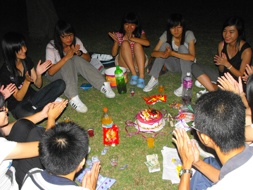 而新闻学院08级广告1班在代理班主任生日的时候为其举办了一个别出心裁的生日会。当晚,班委组织了全班同学在代理班主任楼下架空层围成一个圈唱生日歌,代理班主任一下楼就被这个惊喜所感动。随后,每位同学都对代理班主任说出最想说的一句话,送上诚挚的祝福。