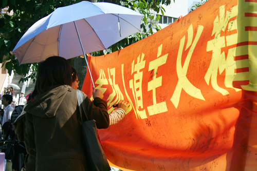 商英学院07国际商务和国际经济法的两个班级团支部利用此次团日活动,走访了大学城里的村子。在小洲村,他们探访了为艺术而甘愿放弃名利的艺术家们,调查了村民的生活;在贝岗村,他们访问了一些摊档的档主和当地的小商家。同学们表示,见识了底层劳动者对待生活和工作的积极态度,不禁让他们反思自身的学习和生活作风,觉得肩上多了一份责任感。