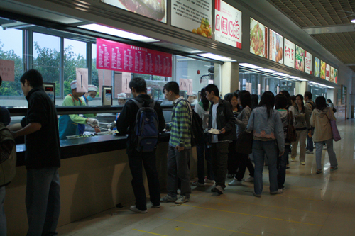 记者发现,南北两校区附近都有“食街”。 北校北门外的“美食街”和南校附近被称为“第四饭堂” 的贝冈村和“山顶”,都是同学们品尝美食的好去处。英文学院08级冯同学是北门食街的“常客”,而且对蛋糕店的蛋挞情有独钟。“种类多,价钱便宜,离宿舍近,也很有聚餐的氛围。”他如此阐述北门食街吸引他的原因。但同样存在于两校区食街的卫生问题却仍旧突出,经贸学院08级的邓同学说:“虽然同学们都有去食街的习惯,但是卫生问题仍然令人担忧。”