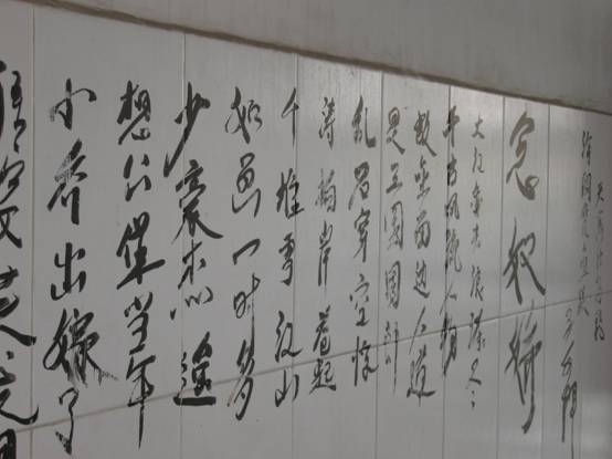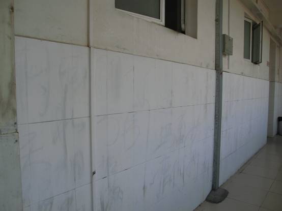 记者来到男生宿舍12栋,明显的看见有些墙壁上残留着毕生们“龙飞凤舞”的书法,大多是古代书法名篇。住在旁边的大一男生告诉记者,开学第一天来到宿舍,就注意到了墙壁上的字,有点好奇,但觉得这种行为始终不可取。据了解,宿管工作人员当时多次用盐酸去清除墙壁上的字迹,可是依然不能完全洗掉,现在的墙壁还留下了淡淡的痕迹。除此之外,记者看见一些宿舍的窗户上涂了一层银漆。经了解,这是因为窗户上写的字无法清洁掉,宿管只好涂上银漆遮住,尽量保持美观。