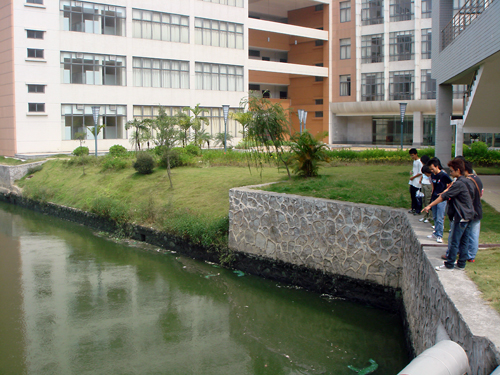 流进语心湖的河水颜色没有多大的变化,但水面上依然漂浮着一两条死鱼。经常在湖边巡逻的保安向记者说到,“从军训时开始,湖水水质就没有以前好,水面上不时会有一两条死鱼,而且水开始有一股臭味,这是以前都没有发生过的。”