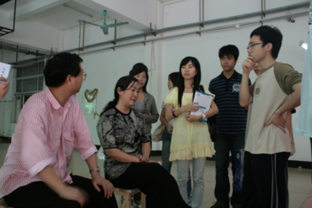 此外,有的编导也在剧中加入 “广外本土化”的元素。如即将在5月25号上演的话剧《暗恋桃花源》,第二幕中,迷糊的场务告诉袁老板说他急用的幕布已经:“上了大卡车送往大学城了”,第三幕中江太太回忆自己和江先生“当年是在糖水店相亲”等。