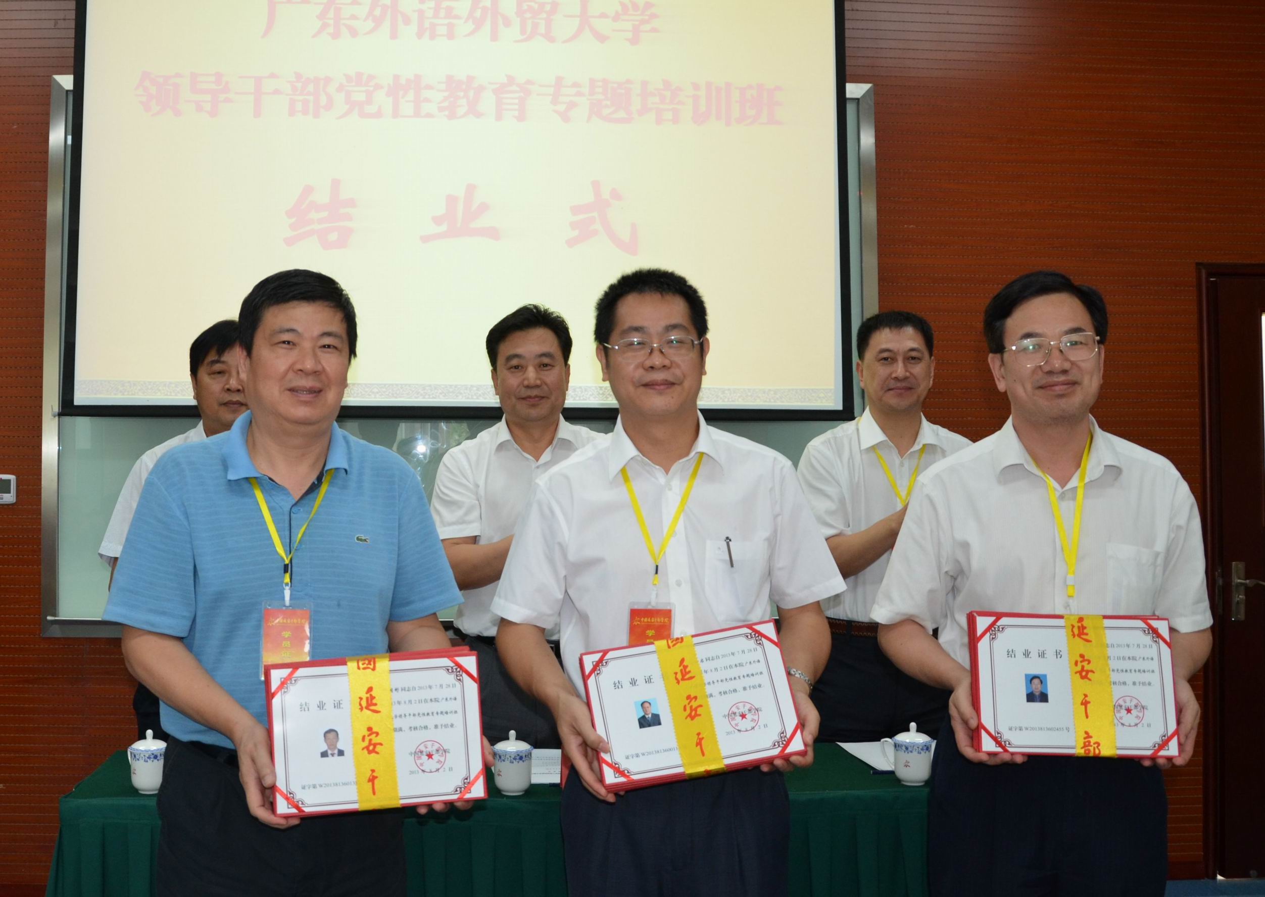 本网讯 8月3日上午,我校领导干部党性教育专题培训班在延安干部管理学院举行结业仪式,34名学员圆满完成学业。中国延安干部学院副院长靳铭、对外交流与培训开发部主任贾波,我校党委书记隋广军以及培训班全体学员出席结业仪式。隋广军代表学校对各位学员顺利结业表示祝贺,并要求大家弘扬延安精神,大兴理论联系实际之风、大兴求真务实之风、大兴密切联系群众之风,紧紧围绕学校第三次党代会所确立的奋斗目标,全面推进学校各项事业科学发展。