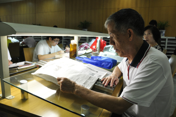 深圳图书馆中,一名老者在认真地阅读报纸。