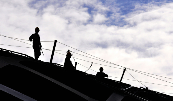 深圳湾体育中心数十米高的顶棚上,工人们辛勤劳动。