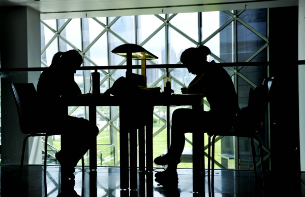 在深圳图书馆的另一个角落,两名高中女学生在复习功课。