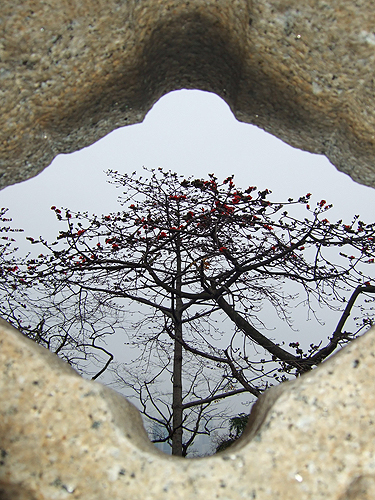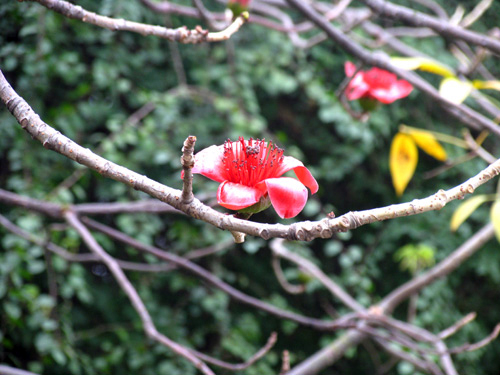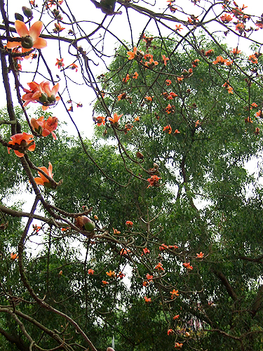 木棉原产于东南亚,树干直立有明显瘤刺;侧枝轮生作水平方向开展;掌状复叶,叶柄很长;花朵大型,橙黄或橙红色;果实为蒴果,成熟后会自动裂开,里头充满了棉絮,棉毛可做枕头、棉被等填充材料。木棉外观多变化:春天时,一树橙红;夏天绿叶成荫;秋天枝叶萧瑟;冬天秃枝寒树,四季展现不同的风情。花桔红色,3~4月开花,先开花后长叶,树形具阳刚之美。