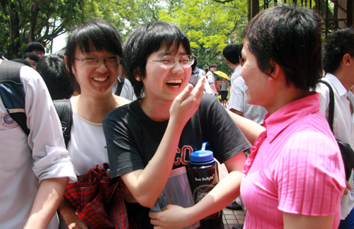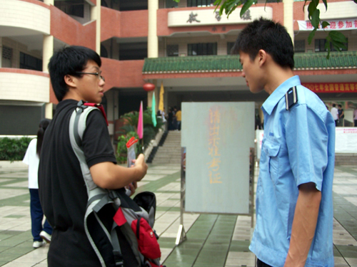 没事自个乐:反正都是热,不如自己活动活动吧,看这位家长,带上自己的DV来到门口不断测试机位,希望待会能在第一时间拍下儿子从考场胜利走出的一幕。 考试后,期待中的喜悦,奋斗的痕迹: