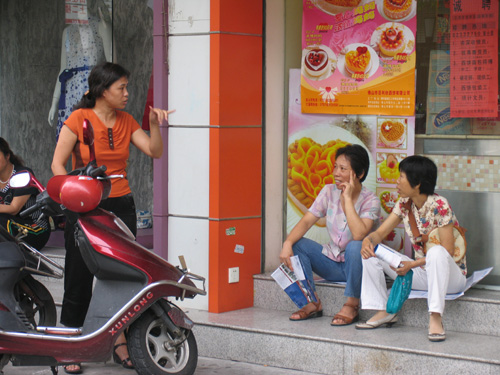 在佛山荣山中学考场外,等待的家长干脆坐在路边西饼屋门口聊天,一家长打出了“6”的手势,难道表示她儿子排名第六?