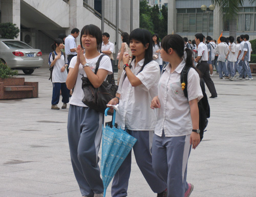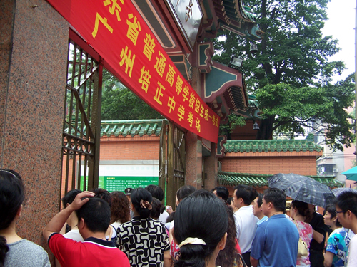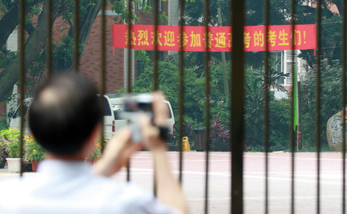 在广州市培正中学考场,考完试的考生在研究门口一大排“相机阵”。