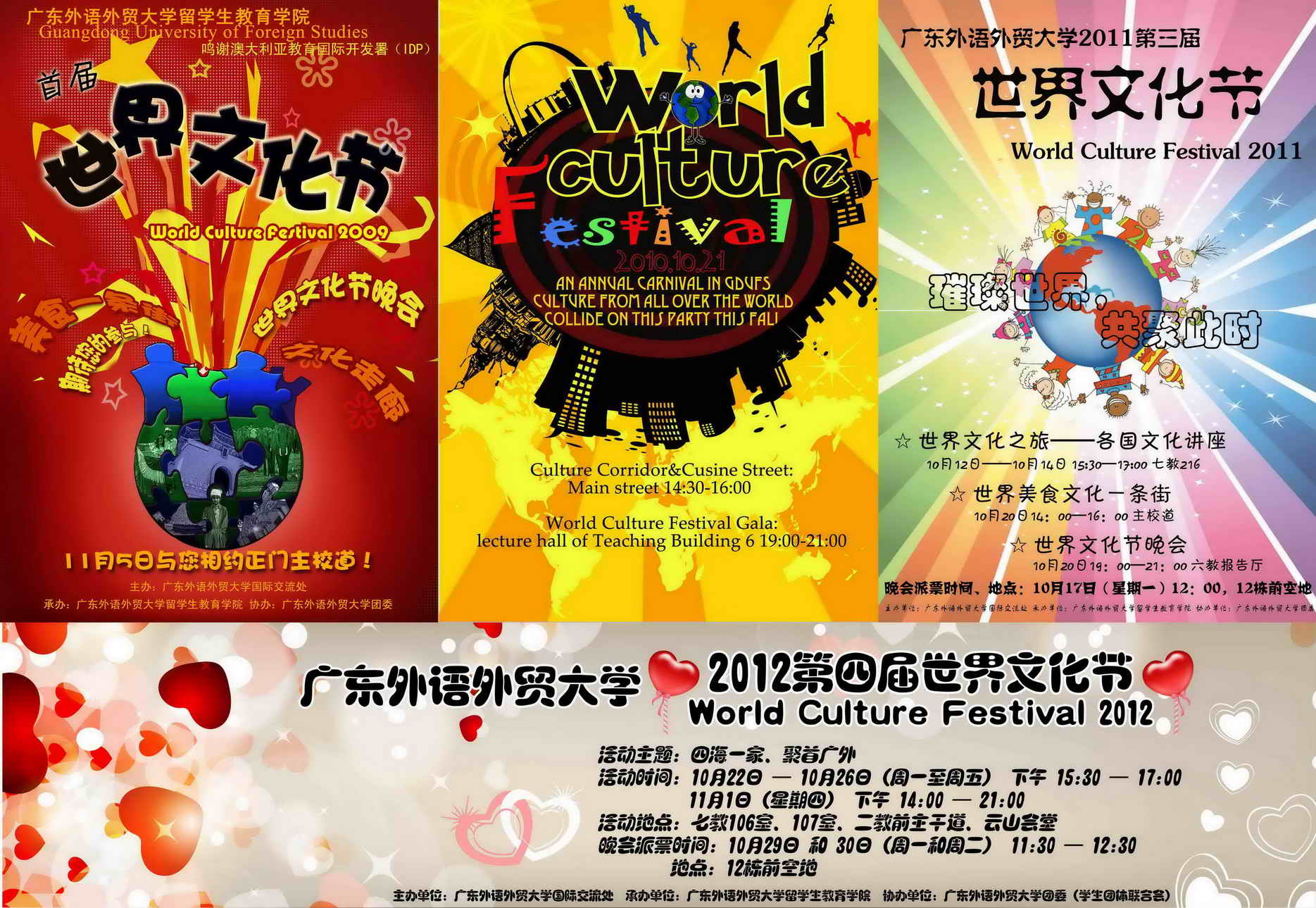 2009-2012年,世界文化节系列活动已经成功的举办了四次。丰富多彩的内容,形式不断的创新受到了广大中外同学的好评。发展至今,世界文化节系列活动共由三部分组成:世界文化之旅,世界文化美食长廊,世界文化节晚会。