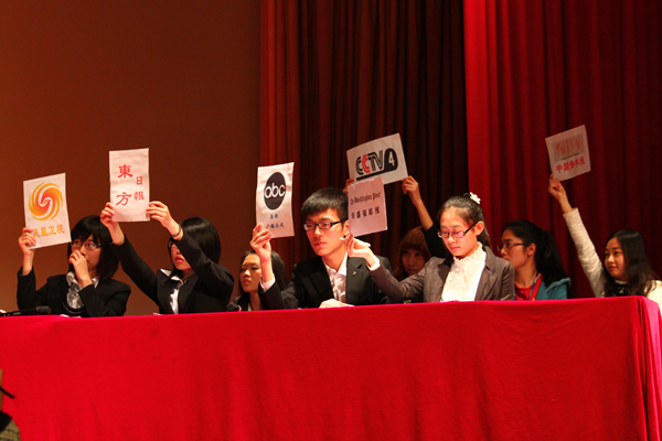 参与模拟新闻发布会的记者组会扮演“BBC”“CNN”等电视媒体或者人民日报、光明日报等报纸的角色。两种媒体都要求现场进行采写编排,纸媒的最终成果是编排好的成品报纸,而电视媒体需要现场播报。为了展现广外外语特色,提高模拟新闻发布会的真实性和专业性,发布组和外媒需进行翻译工作,这对于参赛队伍来说既是历练也是不小的挑战。在发布主题的选取上,模拟新闻发布会主办方工作人员会进行广泛搜索,精心筛选发布主题。“双汇瘦肉精事件”、“河南商丘赵作海案”、“温州动车事故”等时事热点均被选为参赛者挑战的题目。而对于新闻发布方来说,面对“中外”不同性质、不同风格的媒体,如何临场巧妙应答也成为选手需要培养的能力。