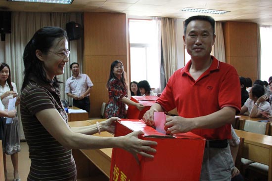 本网讯 9月22日下午,我校15个二级学院遵照新《广东外语外贸大学学术委员会章程》的要求,举行了第七届学院学术委员会换届选举。本次学院学术委员会委员一改以往直接任命的形式,首次由本学院教师投票民主选举产生。据统计,本次选举应到人数为1037人,实到人数807人,投票率为77.82%,分15个场地进行。大会顺利选举产生了我校学院新一届学术委员会委员。