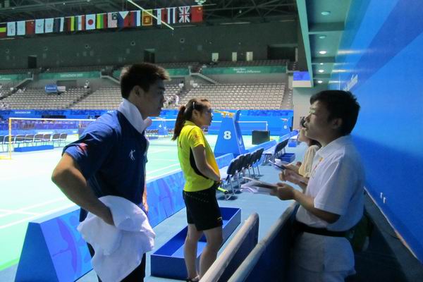 本网讯 8月12日下午,中国羽毛球队到大运村羽毛球训练场馆训练。我校UNS志愿者程功、冯艳华、谢源和田丁在场馆观看训练时接到采访任务,对主教练林立文、主力选手文凯和石小倩进行简短的采访。