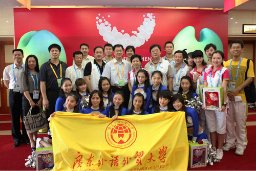 本网讯 8月13日上午,广东外语外贸大学党委书记隋广军、副书记许国彬在校团委书记谢秀兰,体育部主任林少娜,书记李旭武等陪同下,来到深圳体育馆排球馆慰问我校在大运期间驻该馆进行体育展示现场的国魅啦啦队。隋广军一行受到深圳福田区副区长黄漫娥的热情接待。
