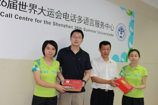本网讯 8月13日下午,深圳大运会外联部语言服务中心经理张海林在我校党委副书记许国彬等陪同下,亲切关怀多语言服务中心志愿者的工作,并赠送了大运会纪念慰问品。