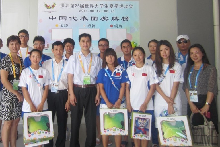本网讯 8月13日上午,大运会开幕的第二天,我校党委书记隋广军、副书记许国彬在团委书记谢秀兰、体育部主任林少娜、体育部党总支书记李旭武等陪同下,前往深圳大运村慰问我校高尔夫球国家队队员和