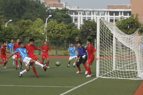 本网讯 8月30日早上,广东省第八届大学生运动会足球小组赛末轮在中大大学城校区人造草场进行。广东外语外贸大学男足迎来了在本次小组赛的最后一个对手——广商。上半场广外连下三城遥遥领先,下半场被广商扳回一球,最终广外以3:1的比分拿下了本场比赛,并以小组第二的成绩出线。