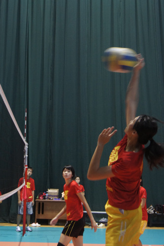 本网讯 8月14日下午,广外女排在广东外语外贸大学南校体育馆排球馆与广中医女排进行了一场排球热身赛,经过近两个小时的角逐,最终广外女排以五局全胜的成绩赢得了这场比赛。在即将开始的大运会中,广外女排与广中医女排位于同一小组中,本次比赛双方也本着练习与交流为目的,打满全部五场比赛。