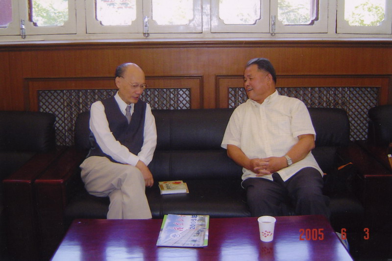 国家教委主任朱开轩同志(左)是把广外第二次下放给广东省政府的主要执行者。广外因同广外贸合并后,他很关心学校的发展,曾两次来校。校庆四十周年,合校十周年时。庄明英(右)曾受学校委托,到教育部拜访了他,向他汇报合校后学校的发展情况,请他参加了校庆,为学校题词。