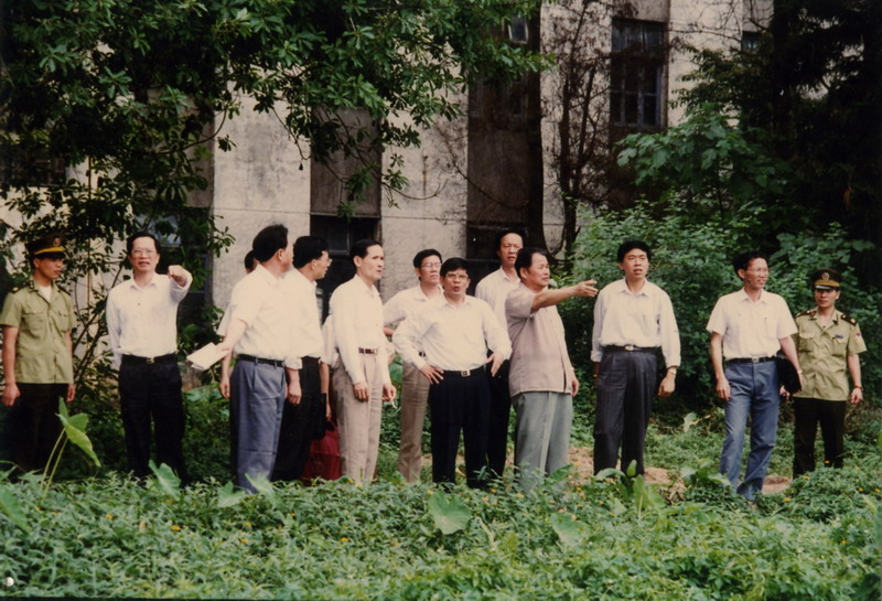 1995年6月,副省长卢钟鹤(右六)、省高教厅厅长许学强(右三)、高校工委书记(左二)等来校商议组建成外语外贸大学后如何加快校园建设问题