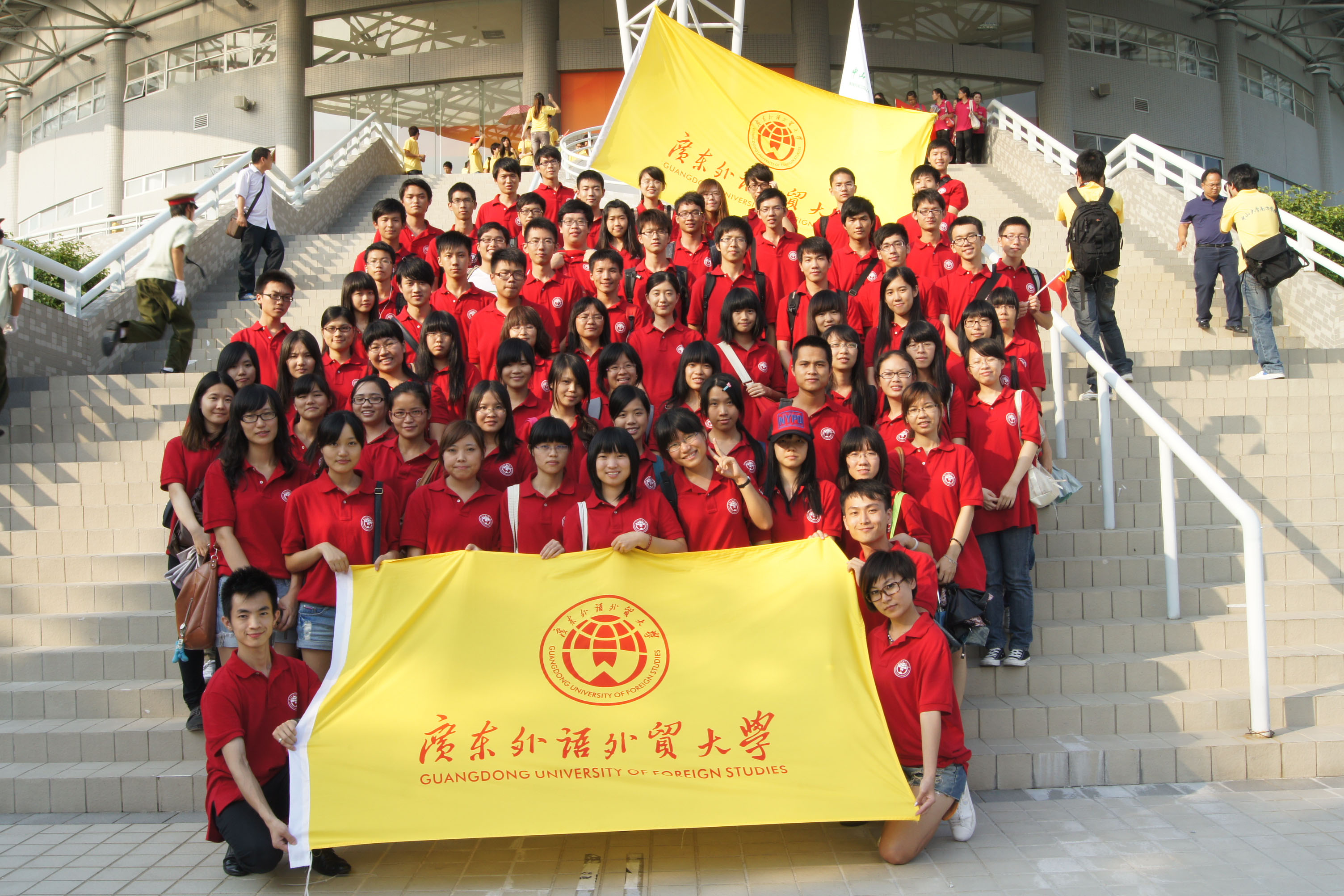 随着国歌奏响,本次拉力赛正式拉开帷幕。来自各高校的同学们身着统一的服装,分布在各个区域,整齐划一,精神奕奕,不时挥舞手中的小红旗,发出掌声和欢呼声。我校同学高举“广东外语外贸大学”的牌子,整齐而响亮地喊出:“明德尚行,学贯中西,广外学子,永远跟党走!” 的口号,引起阵阵叫好声。