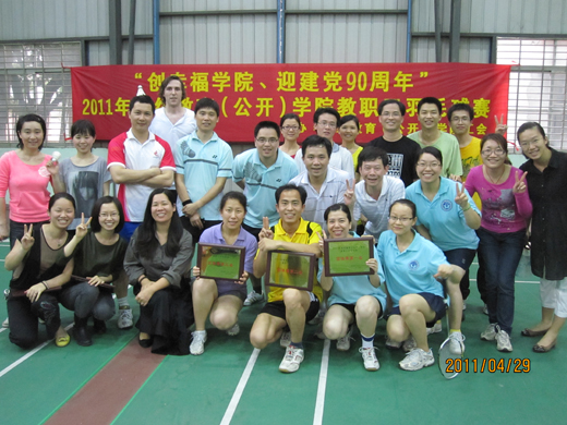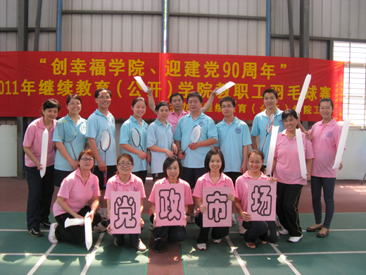 4月29日下午,继教(公开)学院教工羽毛球赛决赛在公开学院羽毛球馆如期举行。经过淘汰赛的角逐,最终的冠亚军争夺战在党政市场联队与英语系之间进行。两支队伍一路过关斩将,终于在决赛中棋逢对手、短兵相接,双方均为强队,势均力敌。英语系在男双先拔头筹的情况下,女单、女双均告失利。在第四场比赛中,党政市场联队男单选手在脚部受伤的不利情况下,稳打稳扎,通过拉吊结合调动对手,充分利用后场优势,结合有力扣杀,控制场上节奏,将场上优势保持到最后,并以2比0拿下比赛。经过四场次的苦战,党政市场联队最终以3比1战胜英语系夺得冠军。在比赛过程中,党政市场联队的拉拉队也格外引人注目,统一的服装、统一的口号与振奋人心的标语,使他们不但夺得冠军也拿下组织奖第一名,可谓锦上添花。
