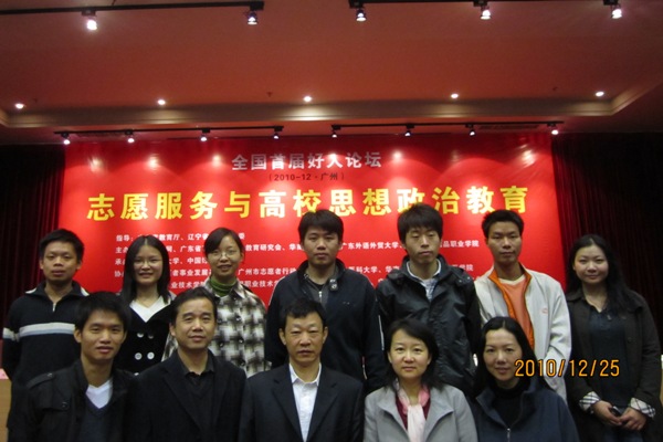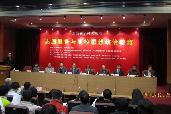 本网讯 12月25日上午,我校与中国好人网、广东省高校思想政治教育研究会、华南师范大学联合主办的全国首届“志愿服务与高校思想政治教育”好人论坛在华南师范大学国际会议厅举行。我校党委副书记许国彬出席并作主题演讲。出席本次论坛的还有政治与公共管理学院院长彭未名、党委书记范静静,校团委副书记谢秀兰以及政管学院部分教师和研究生。来自教育部、辽宁省教育工委、广东省教育厅、共青团广东省委和部分高校的领导、教师100余人参加了论坛。