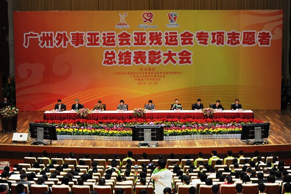 本网讯 12月30日下午,广州外事亚运会、亚残运会专项志愿者总结表彰大会在广州白云国际会议中心隆重召开。大会由广州亚运会、亚残运会外宾和港澳台侨贵宾接待指挥中心、广州市人民政府外事办公室、共青团广州市委员会联合主办。1200名外事志愿者欢聚一堂,共庆广州亚运会、亚残运会外宾和港澳台侨贵宾接待任务取得圆满成功。