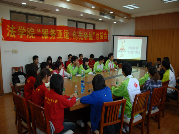 会议接近尾声,卢海清作总结发言。他指出,在校大学生能在大学期间参加亚运这种盛世大典是很幸运的事,每个人在服务过程中的体会和感悟应是自己最大的收获,此次的工作体验也是将来参加工作很好的锻炼。志愿者不仅是广州的名片,也是广外、法学院亮丽的名片。他勉励志愿者要在精神层面上和工作上创先争优,严格要求自己,延续亚运的热情,继续服务好亚残。而对于学习,卢海清表示志愿者们要将志愿工作中的感动、收获转化为学习、成长的动力,在结束志愿工作后努力补上学习进度。最后,他希望志愿者们把服务亚运、亚残的创先争优精神传达到每一个同学,把法学院的班风、学风营造得更好。