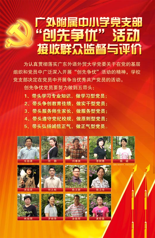 本网讯 近日,为贯彻落实广外党委关于在党的基层组织和党员中广泛深入开展“创先争优”活动的精神,广外附属中小学党支部结合学校实际和党员岗位的特点,制定“创先争优”活动方案,决定在党员中开展争当优秀共产党员的活动,全面推进学校科学发展。