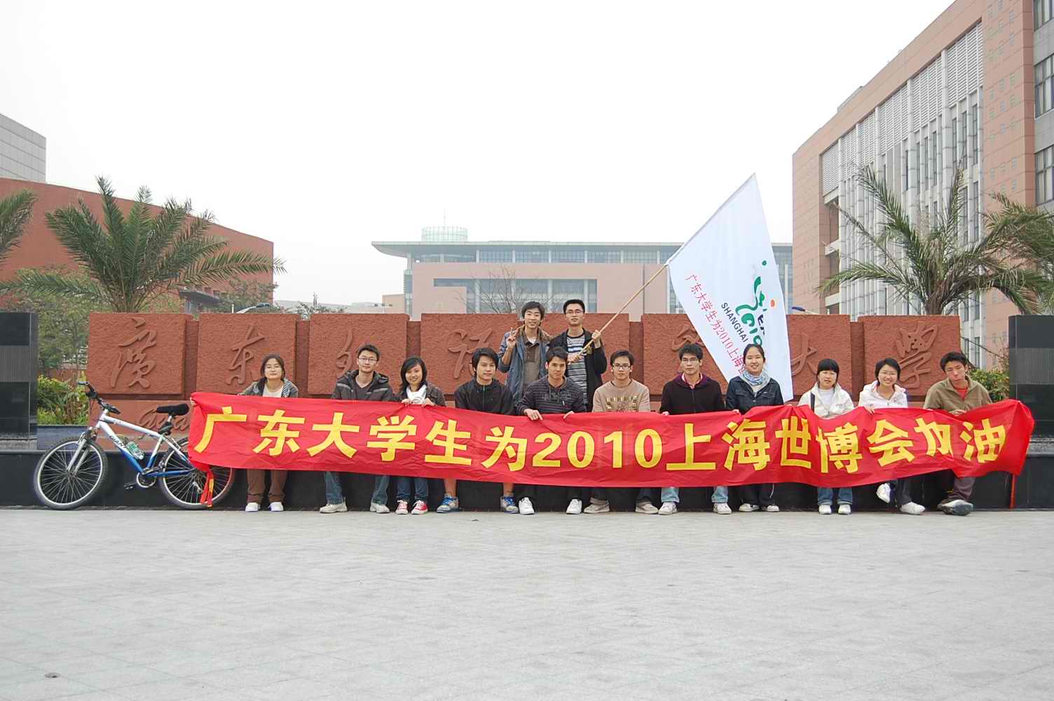 自行车队在大学城各个高校宣传,最后一站是广州大学。随后在广州大学生活区进行横幅签名活动,支持世博会以及这次宣传活动,持续了3个小时的活动画上了圆满的句号。