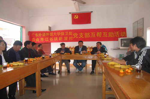 本网讯 12月12日,我校保卫处党支部一行到四会江谷镇新屋村开展城乡党组织互帮互助活动,落实省委组织部提出的“五个一”活动。江谷镇副书记雷国强、组织委员李信芳、新屋村党支部书记曾初,我校保卫处处长钟罗军、副处长李忠德、处长助理邹春权等参加了活动。