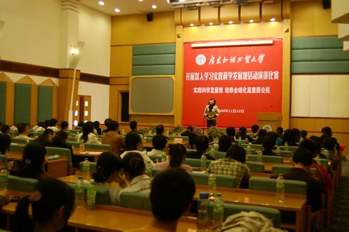 本网讯 自9月以来,我校卷起了一阵阵学习实践科学发展观的热潮。11月13日下午,以“实践科学发展观,培养全球化高素质公民”为主题的演讲比赛在北校区行政楼国际会议厅拉开了帷幕。这是我校开展深入学习实践科学发展观活动之一。