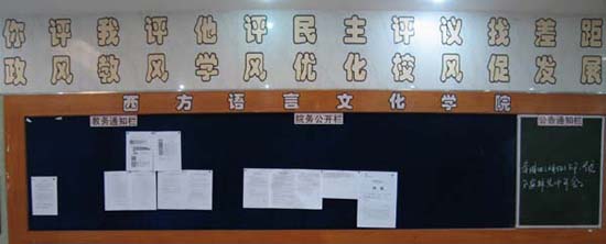四教楼一楼大厅一侧的墙上,标语“你评我评他评民主评议找差距,政风教风学风优化校风促发展”揭示了此次行评的形式与目的。走进西语学院办公室(四教楼105),映入眼帘的是“行评时时在,西语处处春”,反映了西语人不但心中有责任、有约束,而且有和谐、有爱心。拾级而上,来到二楼会议室前,“政风行风共进,教学科研齐飞” 则寄托了西语学院不忘使命、科学发展的愿望与决心。