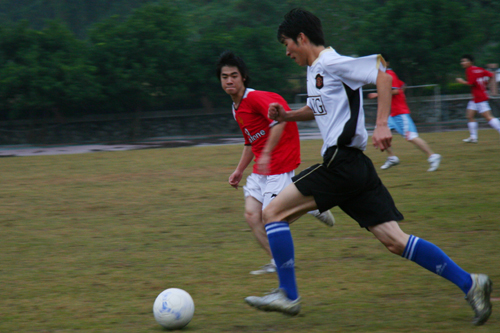 一开场,两队均受场地湿滑的影响,未能很好地控制住脚下的球,只是在中场上一来一回地争夺。待熟悉了场地后,白衫军掀起了一波猛烈的进攻浪潮,一幕幕精彩场面牵动着场外观众的心,或呐喊,或惋惜。上半场比赛几乎呈一边倒形势,场上局面被白衫军牢牢控制。但新闻社代表队斗志未减,尤其是新闻社代表队的守门员梁浩明表现不俗,一一化解了教工队多次有威胁性的射门。上半场后半段,白衫军中的陈静老师在中路接过由队友从底线传来的球后,在中路抢点头球破门,首开记录。随后,杨敏生老师在红衫军禁区前突破对手的双人包抄后推射破门,再为教工队增添一个进球。