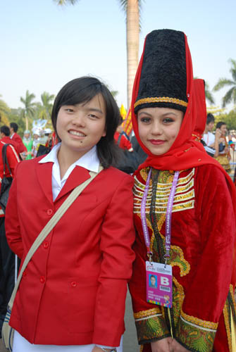 看到各个代表团的一些运动员代表。穿着具有民族特色的衣服,很是新奇。于是和他们交谈起来。