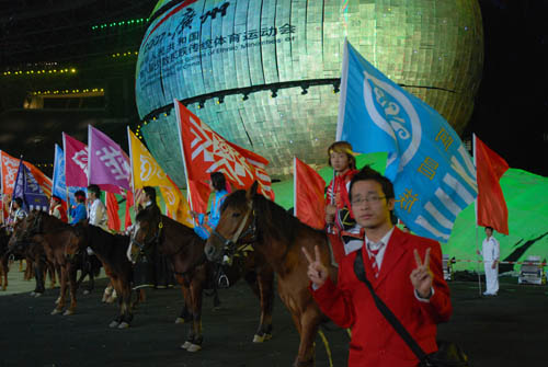 我们终于进了场。现场的气势震撼了我们。绕场一周后,每个代表队都表演了,随后就是开幕式文艺演出。