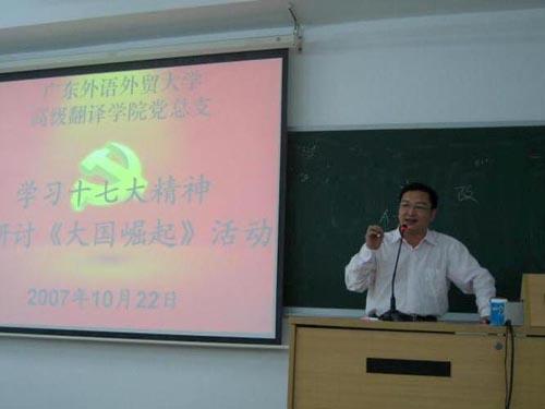 本网讯 10月22日晚,为了更好地学习贯彻十七大精神及了解世界大国发展历史,高级翻译学院党总支举行了学习十七大精神暨《大国崛起》研讨活动。学院党总支书记梁学宏老师主持了本次活动,学院全体教工党员、学生党员、预备党员及入党积极分子参加了此次活动。据悉,本次活动是翻译学院创建先进党支部系列活动之一。
