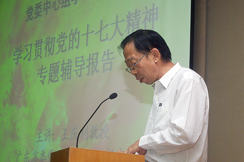 本网讯 秋雨骤降,寒意逼人,我校党员干部学习十七大的热情却依然高涨。10月31日下午,我校党委中心组学习扩大会议在北校区图书馆多功能报告厅召开。广东省委党校科社教研部主任王庆利教授围绕胡锦涛总书记的十七大报告,从十七大的重要意义、当前党政建设、科学发展观以及改革开放四个方面和与会者共同分享了他学习十七大精神的心得体会。
