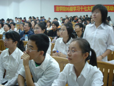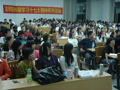 本网讯 为了把学习十七大会议精神的活动推向新的高潮,11月7日晚,由法学院06级级委、06级学生党支部联合主办的法学院2006级学习十七大精神系列活动之三——学习十七大精神知识竞赛在南校区教学楼C308开展。校学生处副处长李和民、法学院党总支副书记胡文涛等老师莅临现场应邀对比赛进行指导,法学院06级各班组成的代表队参加。