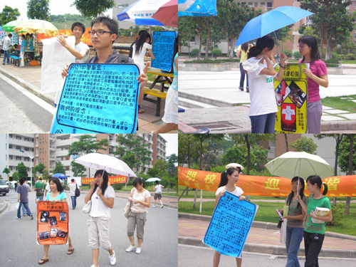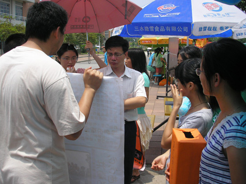 活动可以分为三个部分:宣传05563爱心助学基金;为基金筹款;倡议大家签名支持爱心助学活动。为了吸引更多的同学参与到活动中来,该支部把开展的时间定在中午12点左右。支部出动了几乎所有的成员,分布在活动现场周围,对我们的爱心助学基金进行宣传,并倡议大家为签名支持爱心助学,共建和谐校园和和谐社会。