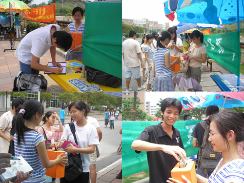 活动一开始就吸引了很多同学,许多路过的同学主动了解有关基金的情况,在签名支持的同时也慷慨解囊,用行动支持此次爱心助学活动。有一位同学在捐了款之后留下了联系方式,他表示愿意自己资助一个贫困的学生。